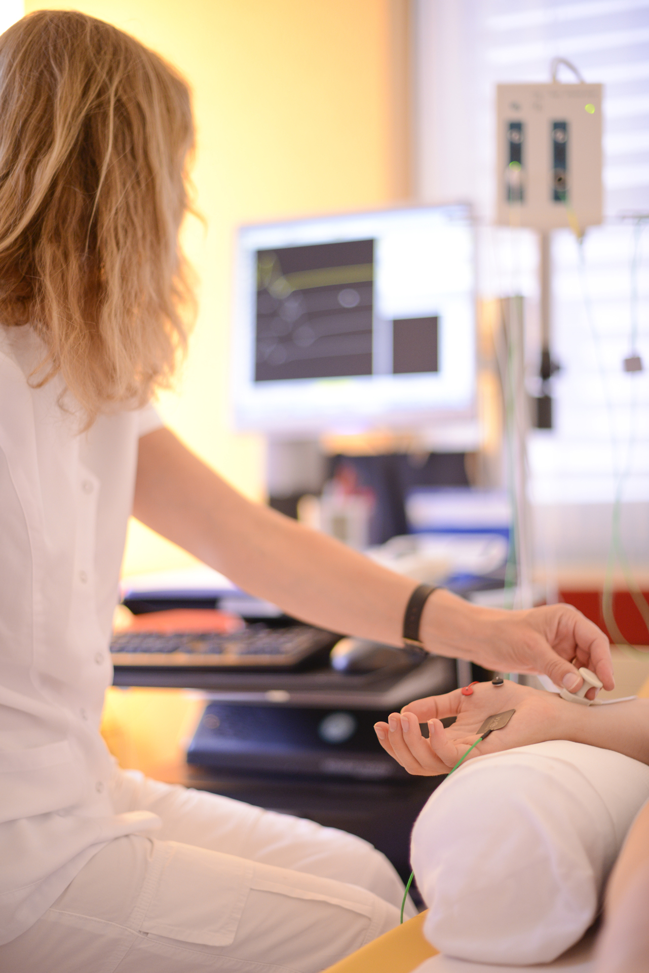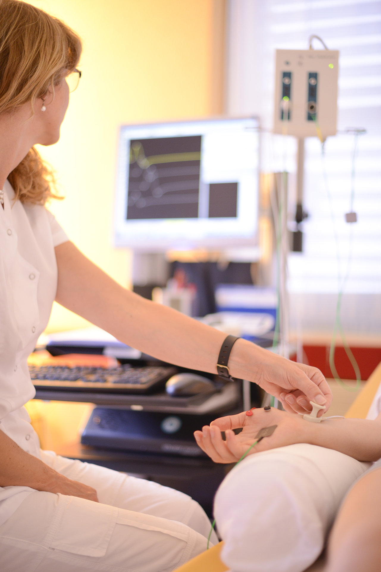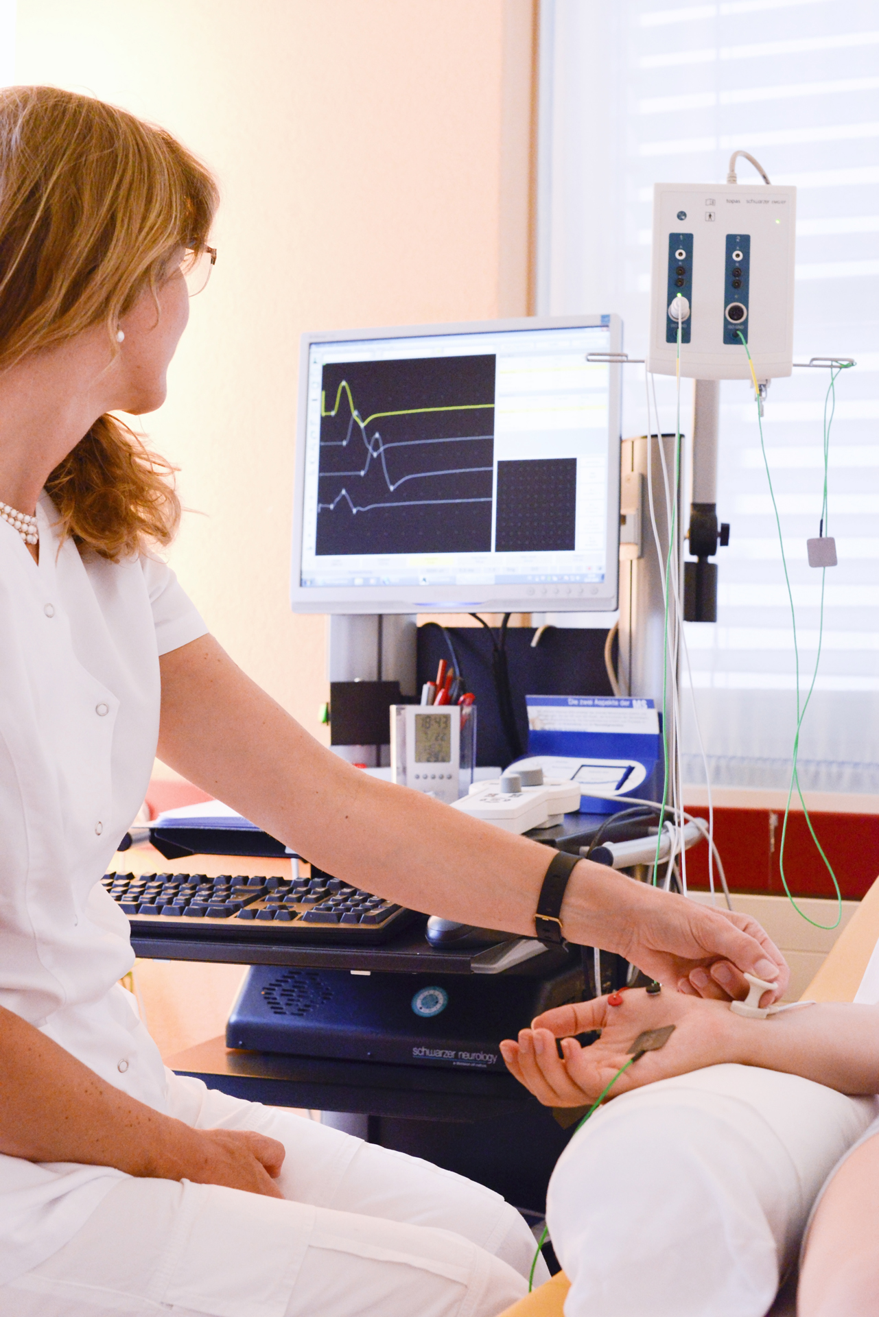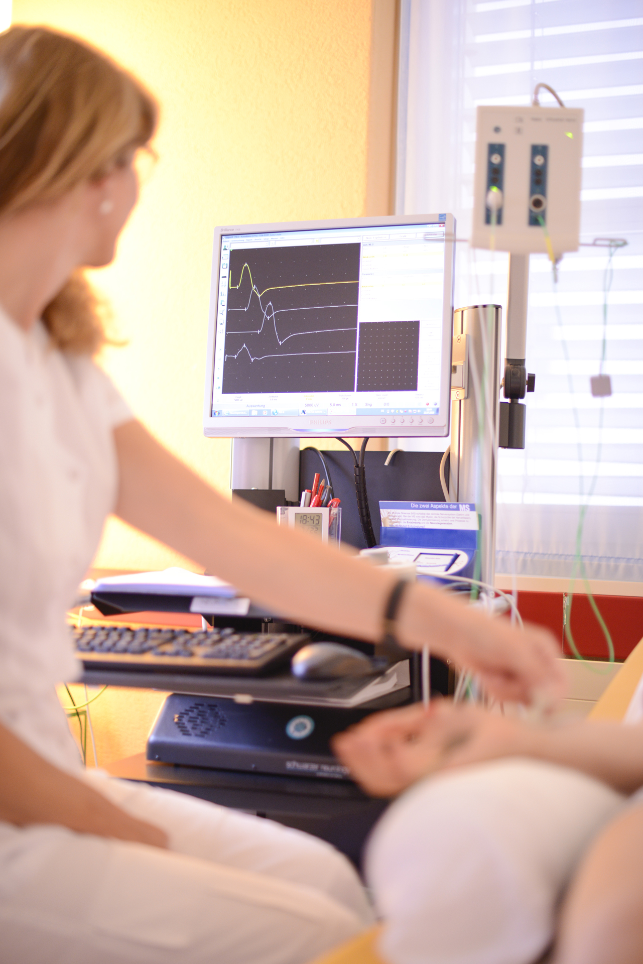Die Elektromyographie (EMG) zeigt die Aktivität von Muskelzellen. Da alle Muskelzellen durch Nerven versorgt werden, sind damit nicht nur Aussagen über die Funktion der Muskeln sondern auch Rückschlüsse auf die zugehörigen Nerven möglich. Die Untersuchung wird mit einer dünnen Nadelelektrode durchgeführt, da die Ableitung in unmittelbarer Nähe der Muskelzelle erfolgen muss. Mit Hilfe des EMG können Schädigungen der Nerven ausserhalb von Gehirn und Rückenmark sowie Erkrankungen der Muskelzellen selbst beurteilt werden.